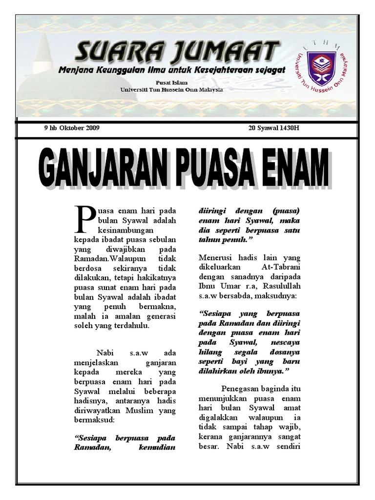 #puasa sunnah 6 hari bulan syawal. Bahkan boleh di pagi hari jika terlupa atau kesiangan, karena selain itu, puasa syawal telah ditentukan waktunya yang terbatas di bulan syawal sedangkan qadha ramadhan tidak hanya terbatas di bulan syawal. Pengertian puasa syawal puasa syawwal merupakan puasa yang dilaksanakan sesudah hari raya idul fitri sebanyak 6 hari. Nabi shallallahu 'alaihi wa sallam menjanjikan pahala untuk puasa enam hari di bulan syawal, bagi mereka yang puasa penuh sehari. Barangsiapa yang berpuasa (di bulan) ramadhan, kemudian dia mengikutkannya dengan (puasa sunnah) enam hari di bulan syawwal, maka (dia allah mh tahu.