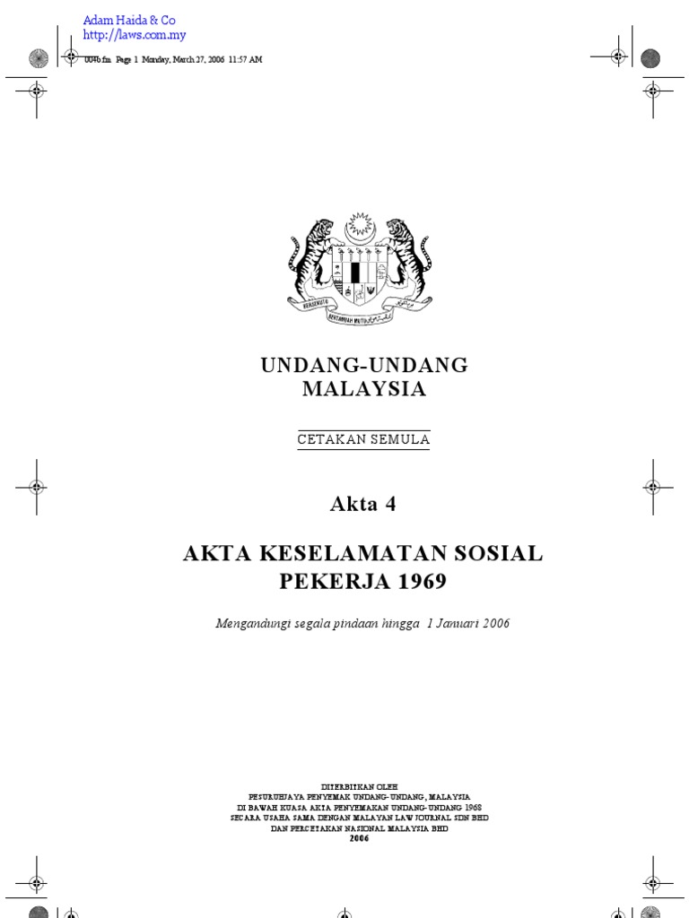 Results for akta keselamatan sosial pekerja 1969 translation from malay to english. Sejarah penubuhan perkeso bermula pada tahun 1958, apabila kajian keselamatan sosial telah dijalankan oleh pakar daripada pertubuhan buruh antarabangsa (i.l.o) lalu pada tahun 1962, sebuah jawatankuasa tertinggi dibentuk untuk mengkaji hasil kajian ini. Skim keselamatan sosial mula diperkenalkan di negara ini pada 1958 sebaik malaysia mencapai kemerdekaan pada 31 ogos 1957. Get this from a library! Jadual kelima akta keselamatan sosial pekerja 1969 hukum kahwin semasa mengandung anak luar nikah hukum beriman kepada hari kiamat hukum suami tidak memberi nafkah batin selama 1 bulan hukum anak luar nikah dengan bapa hukum faraid jika ayah meninggal tiada anak lelaki hukum istri minta cerai dalam islam hukum suami tidak memberi nafkah kepada isteri yang bekerja hubungan manusia dengan allah